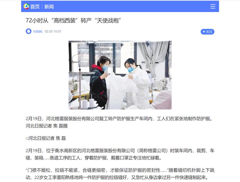 十萬(wàn)級(jí)潔凈車間的建成對(duì)于河北格雷來(lái)說(shuō)是具有跨越式意義的一大步,從2月初疫情爆發(fā)時(shí)期的臨危援命、快速轉(zhuǎn)產(chǎn)到如今的十萬(wàn)級(jí)無(wú)菌車間的建成投產(chǎn),從之前的隔離衣、手術(shù)衣到現(xiàn)在的無(wú)菌防護(hù)服,河北格雷一直在與時(shí)間賽跑,力求以最快速度承擔(dān)更多責(zé)任,不負(fù)各界信任與托付。